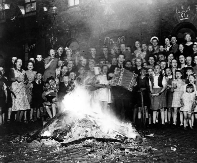 A celebratory 'end of the war' bonfire. Many street parties would have gone on until late hours, and ended with a bonfire. After years of living with blackout conditions, when no-one was allowed to show any light whatsoever at night, a bonfire was a rare delight for young and old.