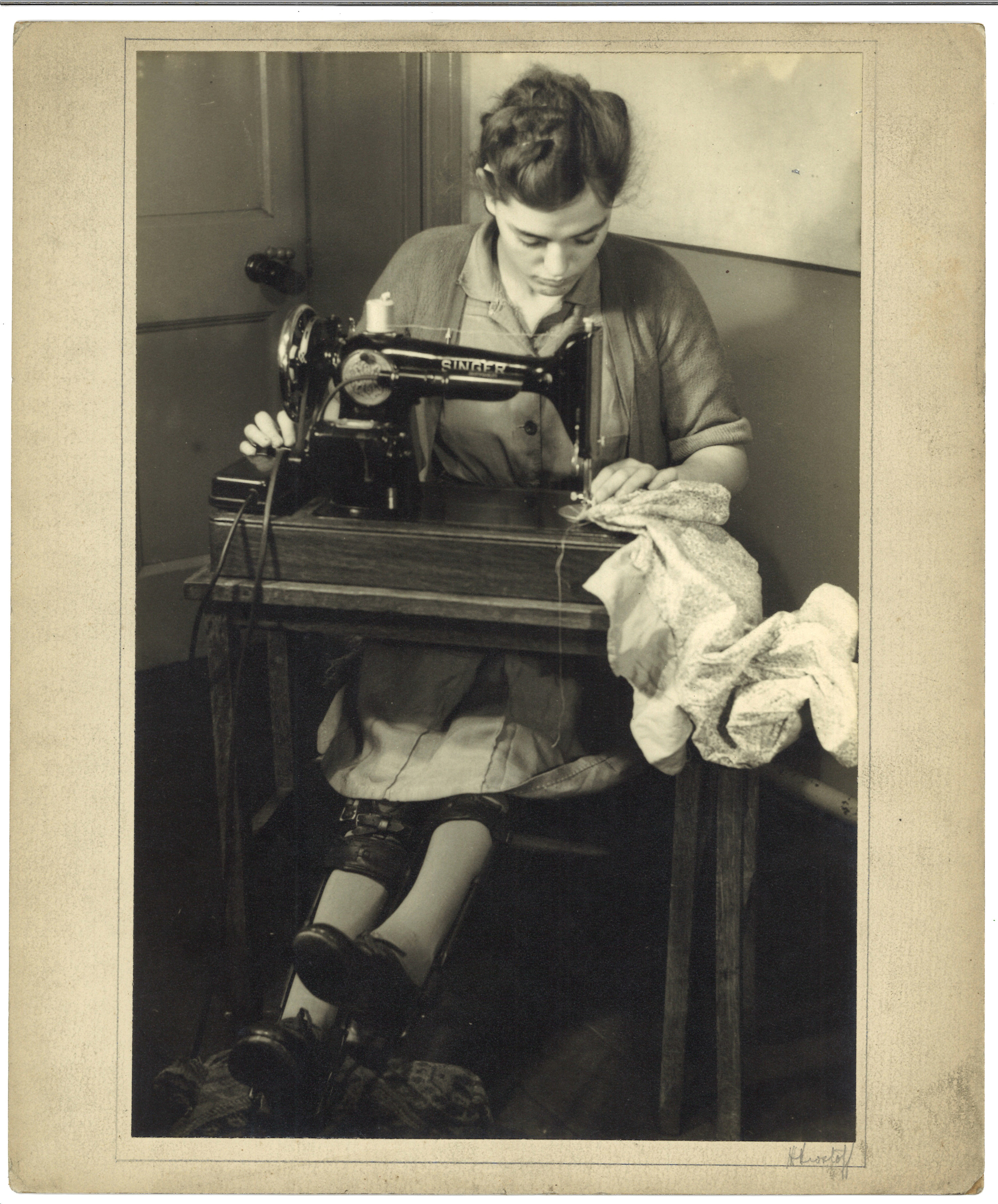 This photograph shows a student at Potternewton school learning how to use a sewing machine. Looking closely we can see that she is wearing braces on her legs which indicates that she may have suffered from Polio or another debilitating disease.