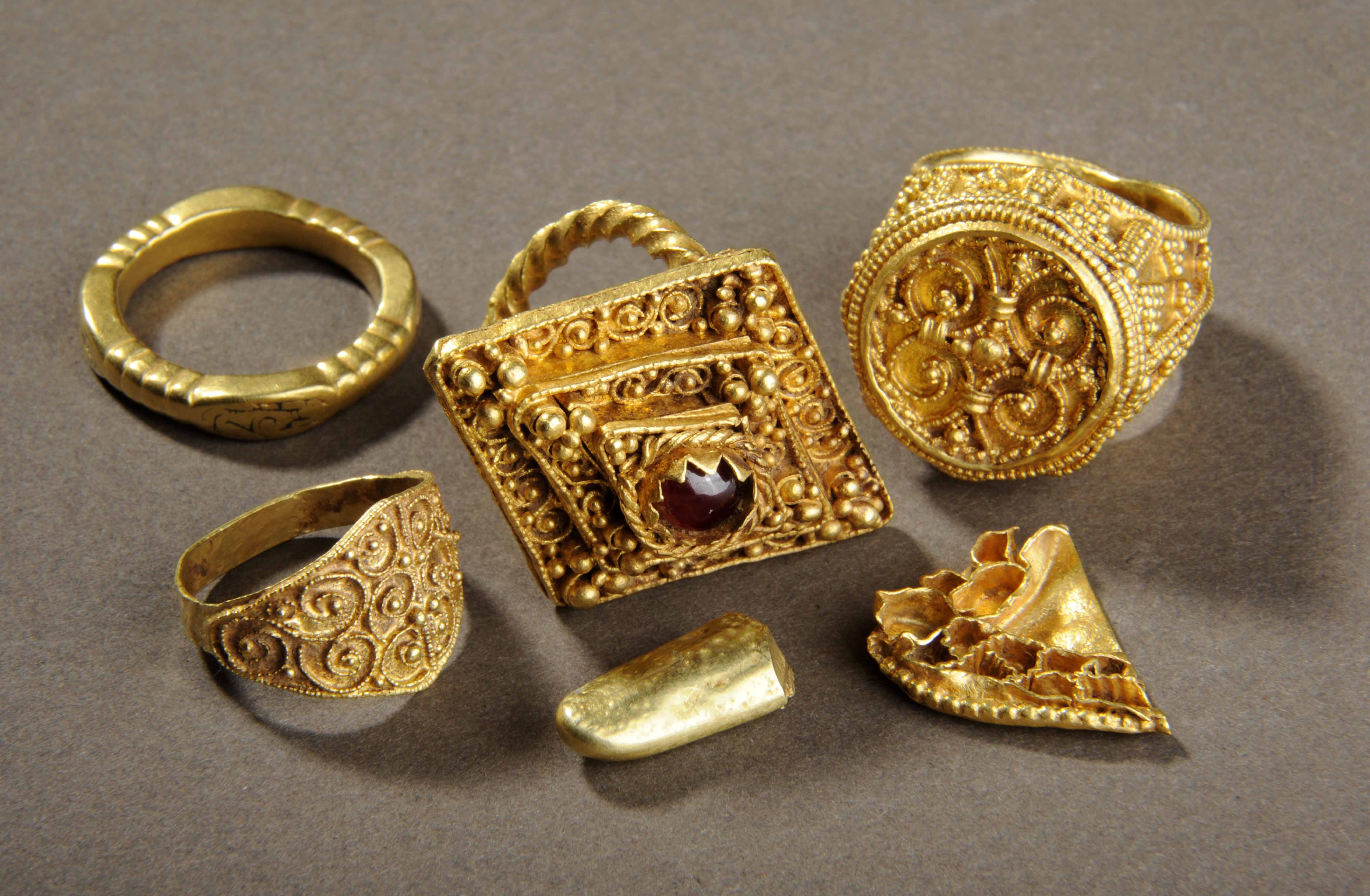 The West Yorkshire Hoard. This collection of early medieval treasure was found in 2008-2009 in the Leeds area. It mostly consists of very high quality gold jewellery. Seven items were found, including four gold rings, a fragment of a brooch, a piece of gold ingot and a lead spindle whorl. It is thought to have been buried sometime around the 10th century.