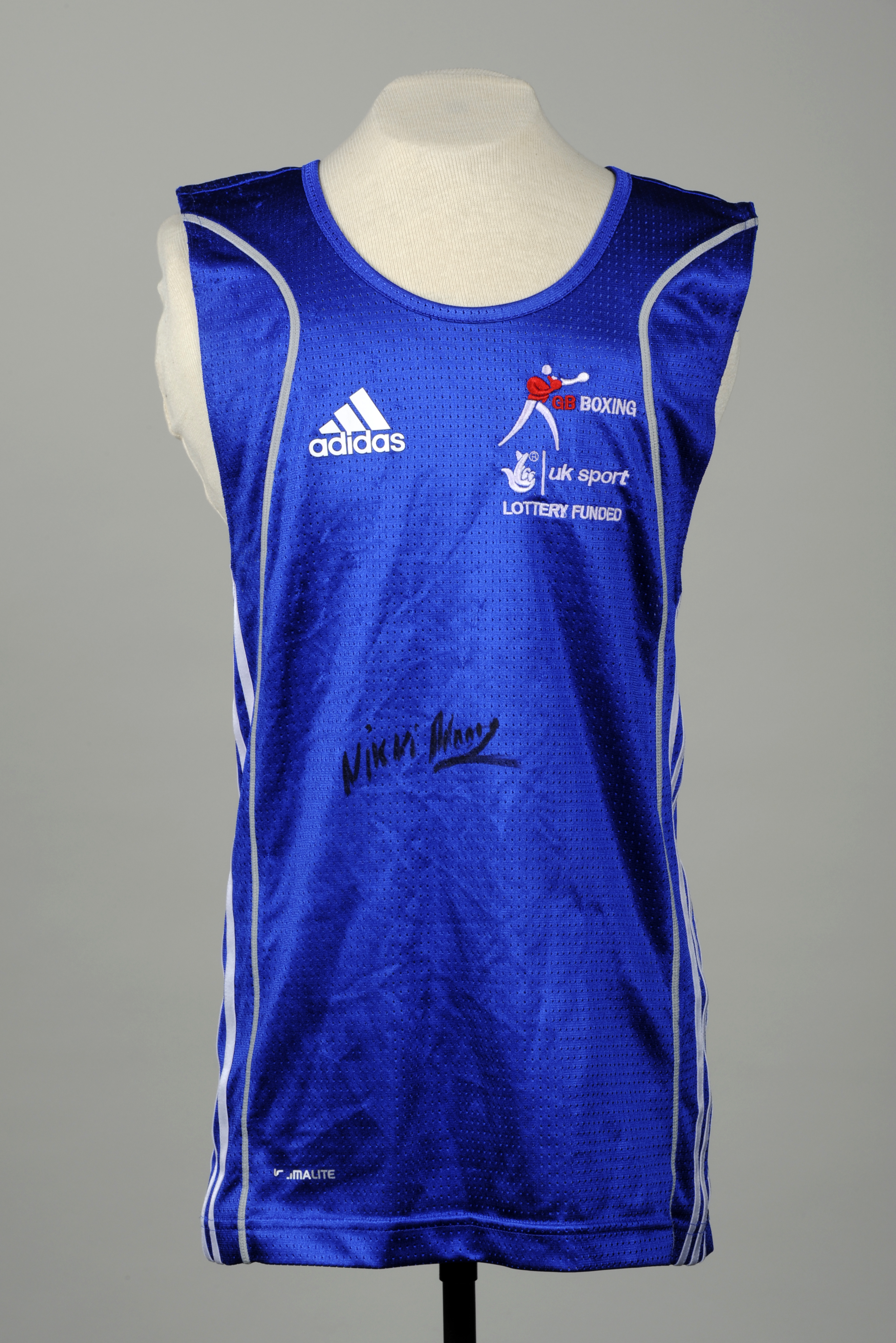 This top was worn by the boxing Olympic gold medal winner Nicola Adams. She has signed the front of it before donating it to the collection at Leeds Museums and Galleries.