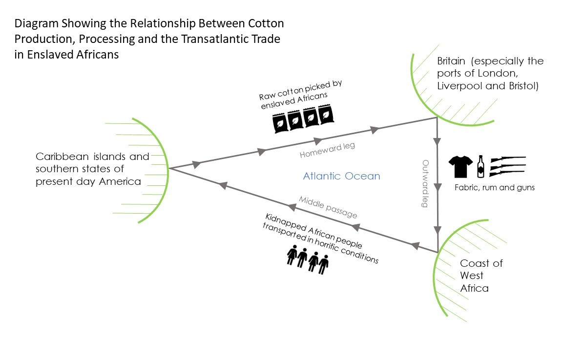 Diagram showing the relationship between cotton production, processing and the Transatlantic trade in enslaved Africans.