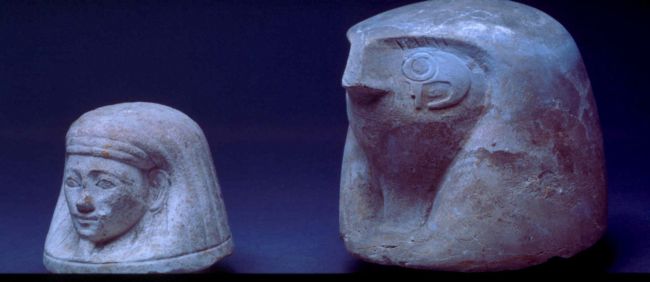 These canopic jar lids show two of the four sons of Horus who protected different organs of the mummies. There are the human faced Imsety, protector of the liver and the hawk-headed Qebehsenuf, who protected the intestines. The lids are made from limestone and date to c.1300 BCE.