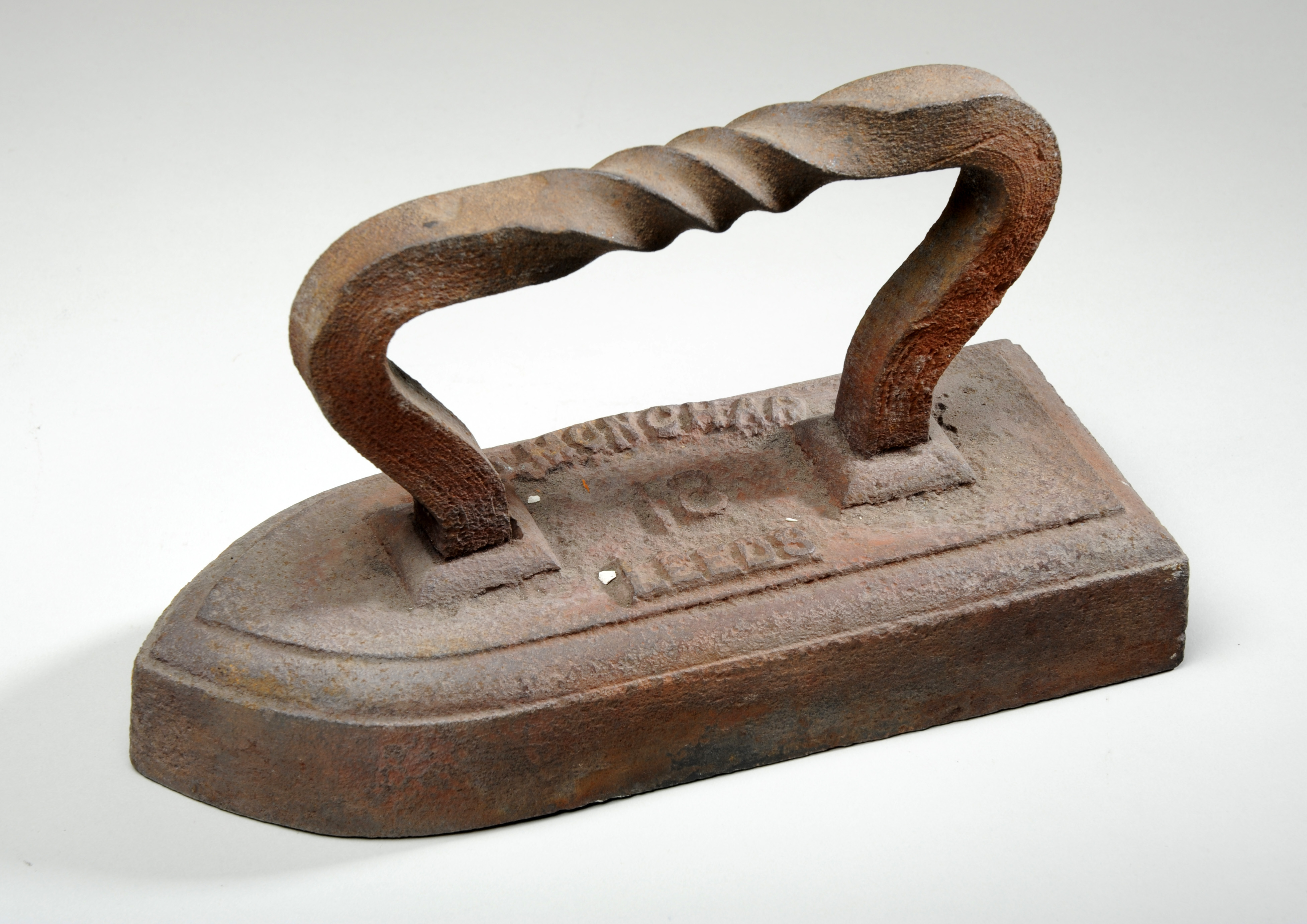 Flat irons like this were used for ironing. The family would likely own more than one, and they would be used in tandem, with one heating on the range while the other was being used. When the one being used cooled down, it was swapped for the one on the range. This type is made of solid cast iron and is heavy!