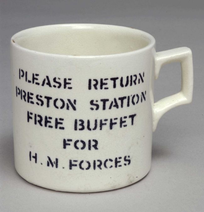 Mug used for tea and coffee at the Preston Station Free Buffet during World War Two. This mug held cups of tea for soldiers and sailors. They were specially commissioned for the Preston Free Station Buffet. They were labelled so that mugs left on the trains could be sent back to Preston Station, though they were highly prized collectors’ items and some ended up as far away as Iceland, Newfoundland and the trenches in France. When trains did not stop in Preston, the volunteers would pass whole buckets of tea and baskets of food up to the carriages so that these soldiers did not need to miss out.