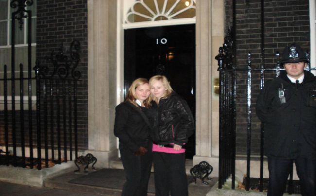 Two pupils from Winifred Holtby School outside 10 Downing Street