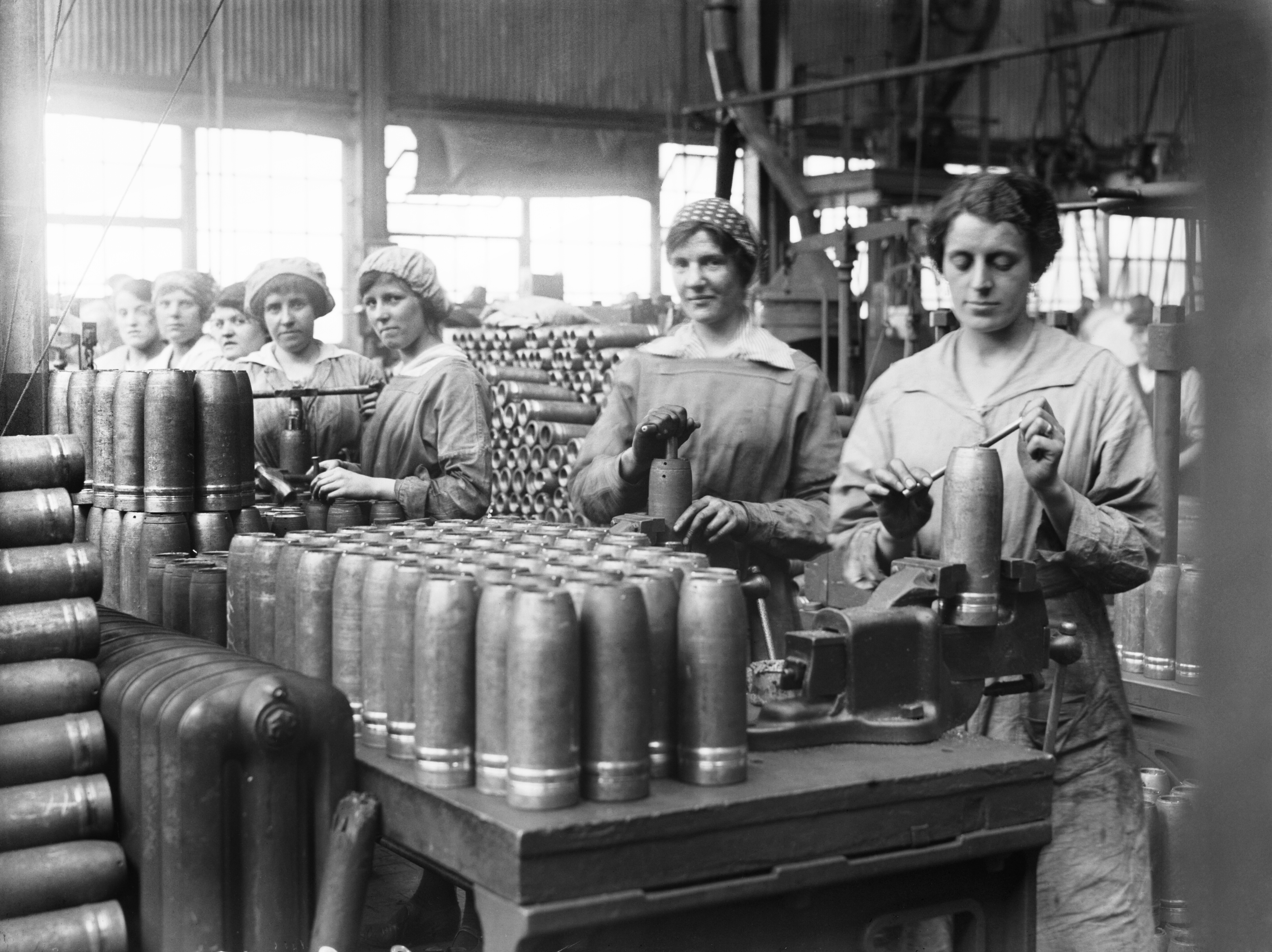 This photograph shows women at work making armaments in a munitions factory during WW1. With men away at war, women filled the labour shortage, competently doing all kinds of jobs they had previously been denied access to.