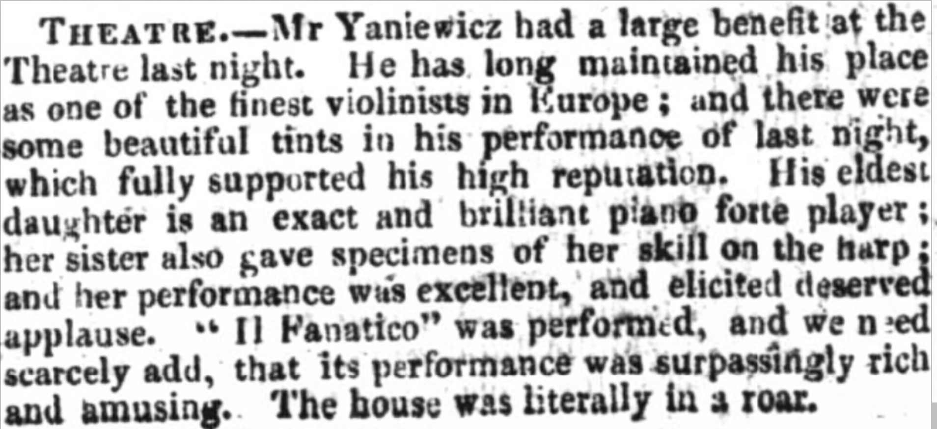 A newspaper article from the Edinburgh Evening Courant, Thursday 10 January 1828, which reviews Felix Yaniewicz’s benefit concert. It adds that Felix’s eldest daughter performed on the pianoforte and her sister performed on the harp.