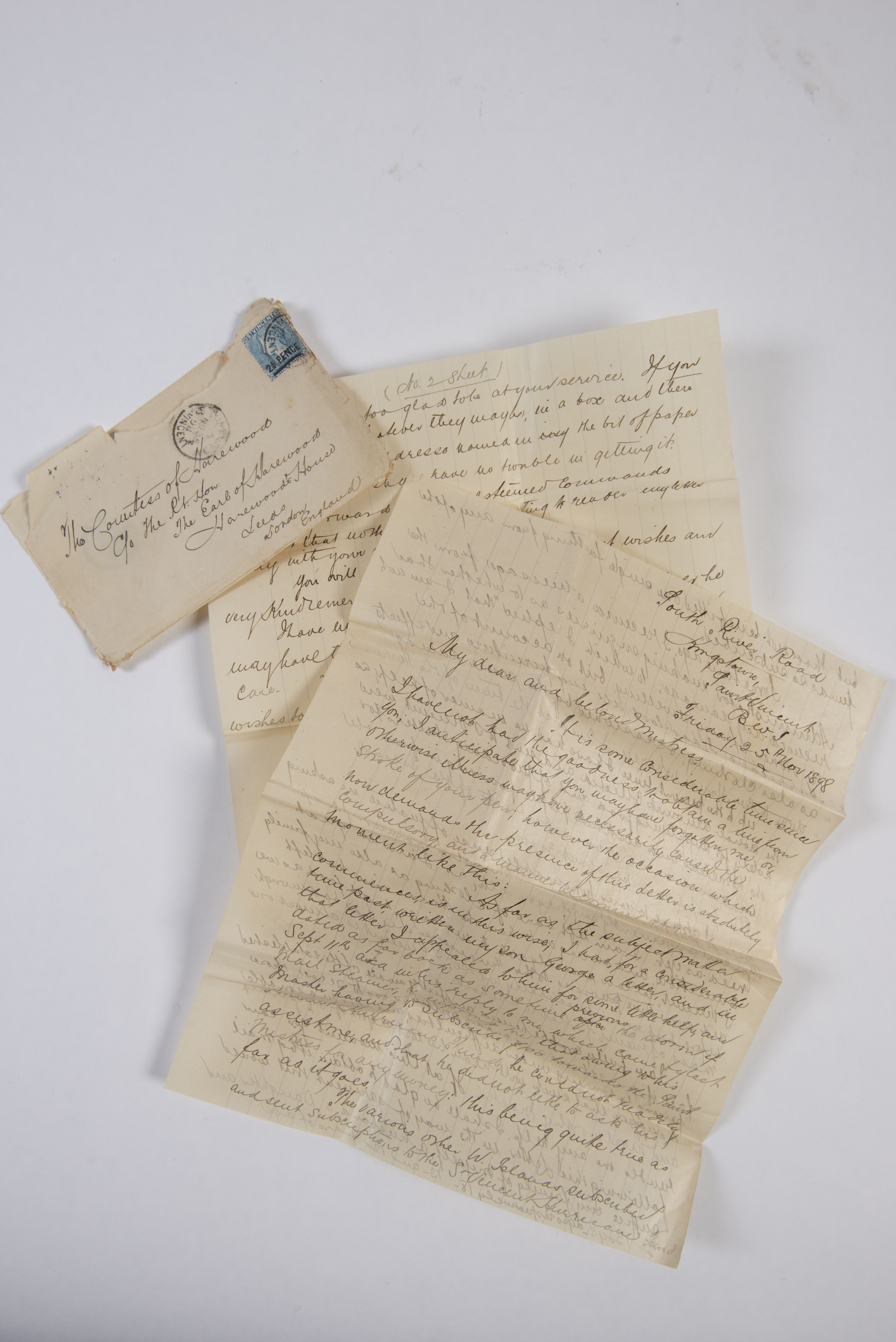 This letter, post marked November 25, 1898 is one of several letters from Bertie’s mother, Amelia, to the 5th Countess of Harewood. The letters provide us with a fascinating record of social history. They give us an insight into the lives of Bertie’s family members back in St. Vincent, and record gifts of money and ‘goods’ that the Countess sent to Amelia.