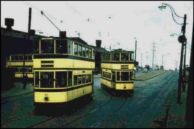 A photograph of tramcars from the 1950s taken by David Bradley. The front tram is the number 97.