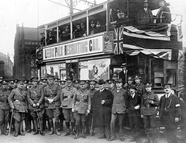 Lieutenant Colonel S.C. Taylor and officers of Leeds Pals Battalion stand in front of the decorated recruitment tramcar in June 1915. Over 800 recruits passed through the tram and the Leeds Pals recruited approximately 2,000 troops, the average age of recruits was 20-21.