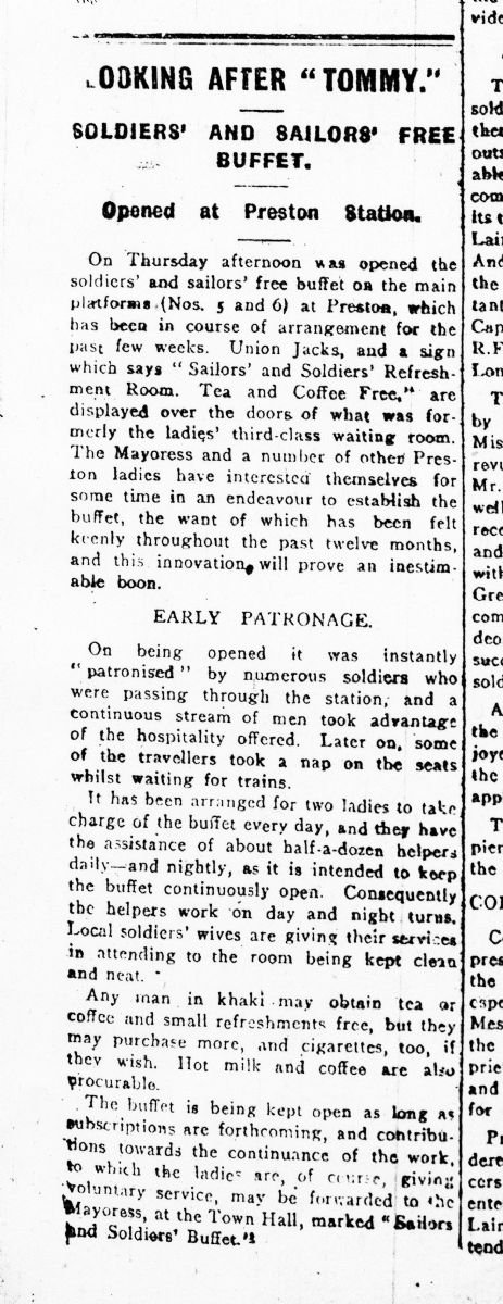 The newspaper article celebrates the opening of the the Preston Station Free Buffet. The article tells us who was volunteering and which important person in Preston helped them.