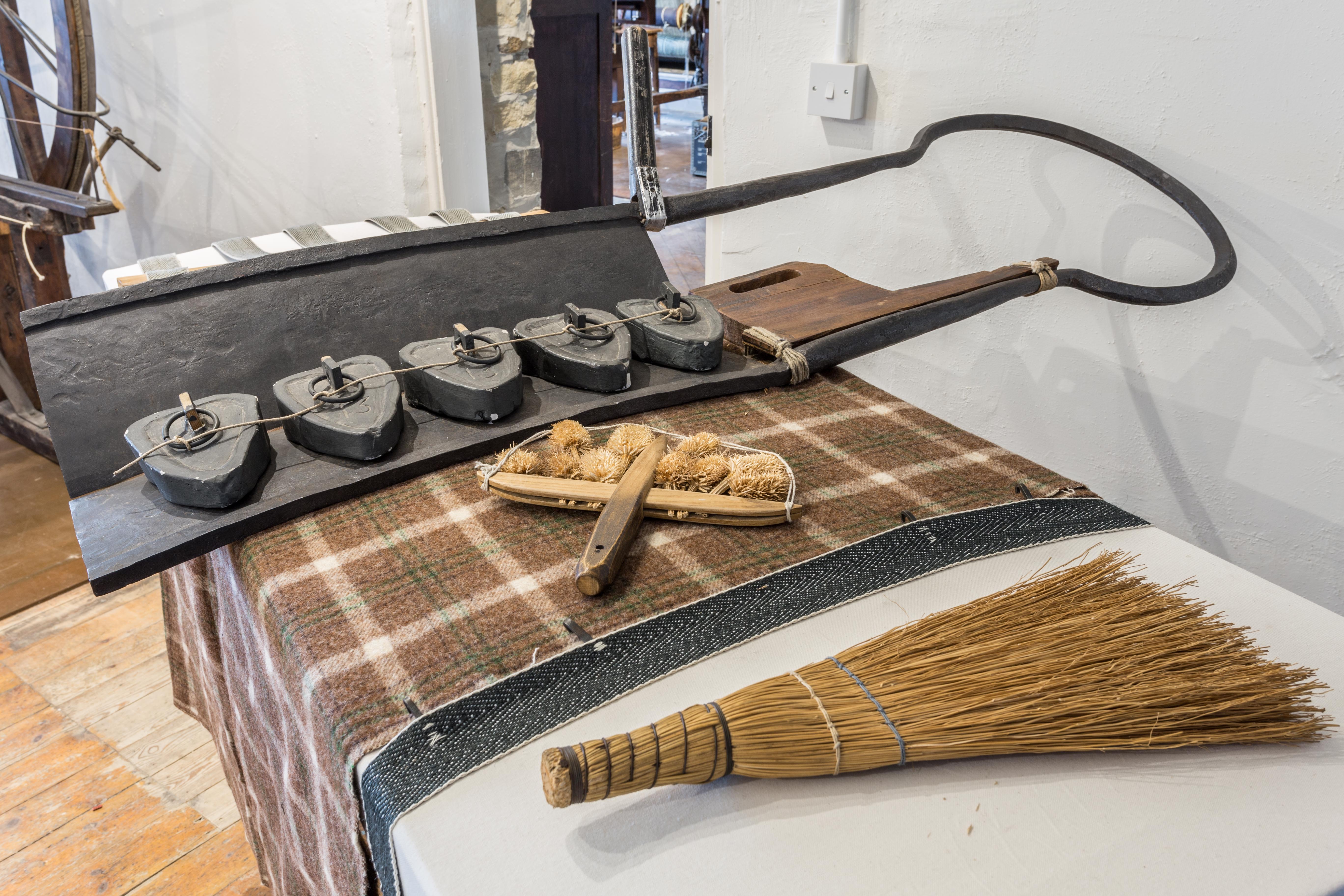 A cropping table with woollen cloth spread out ready for cropping. The tool with the teasels was used to raise the nap of the cloth, and then the weighted down metal blade (the shears) would be worked across the cloth to shave the surface smooth. The little bits of wool would then be swept away using the hand brush. Cropping was a skilled job and was outsourced to a cropping mill.