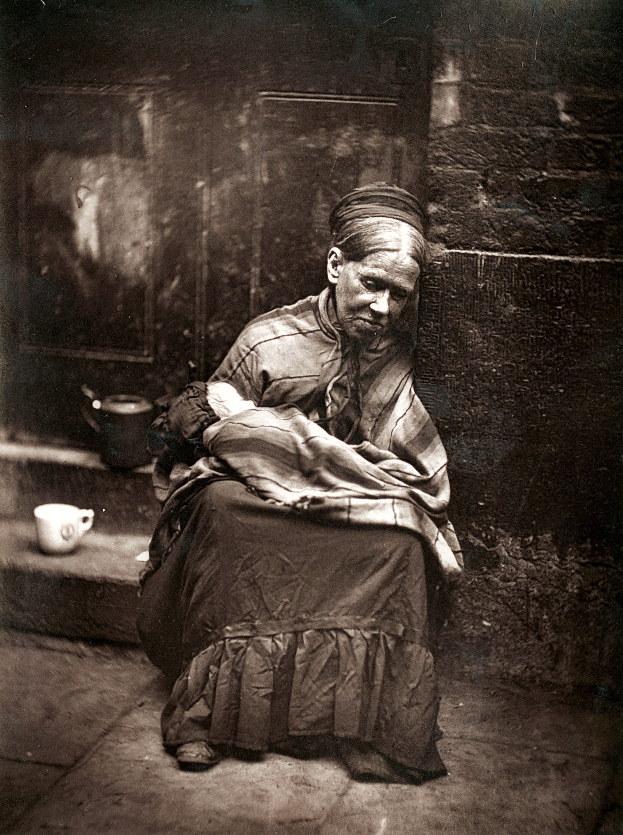 This shocking image of a woman, probably in her 50s, known as a crawler was widely reproduced. It is taken on the steps of the workhouse on Short’s Gardens. Adolphe Smith says the woman earnt bread and a cup of tea by looking after the baby while the mother went to work. She was known as a crawler as these people were homeless and would ‘crawl’ from one area to another, sleeping outdoors or in casual wards.