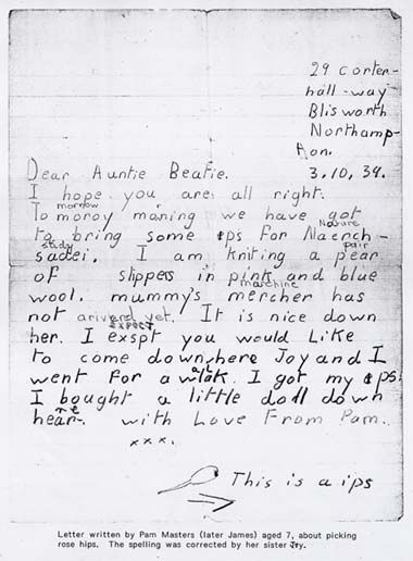 A letter home from a Northamptonshire evacuee. The evacuee is excited to discover new things about living in the countryside. The spelling was corrected by her elder sister.