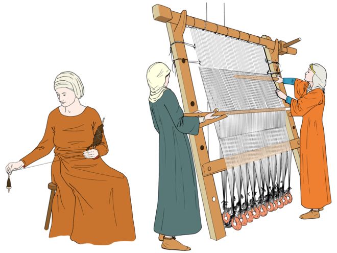 Illustration showing Viking era textile workers. The seated woman is spinning yarn, while the two standing women use a loom.