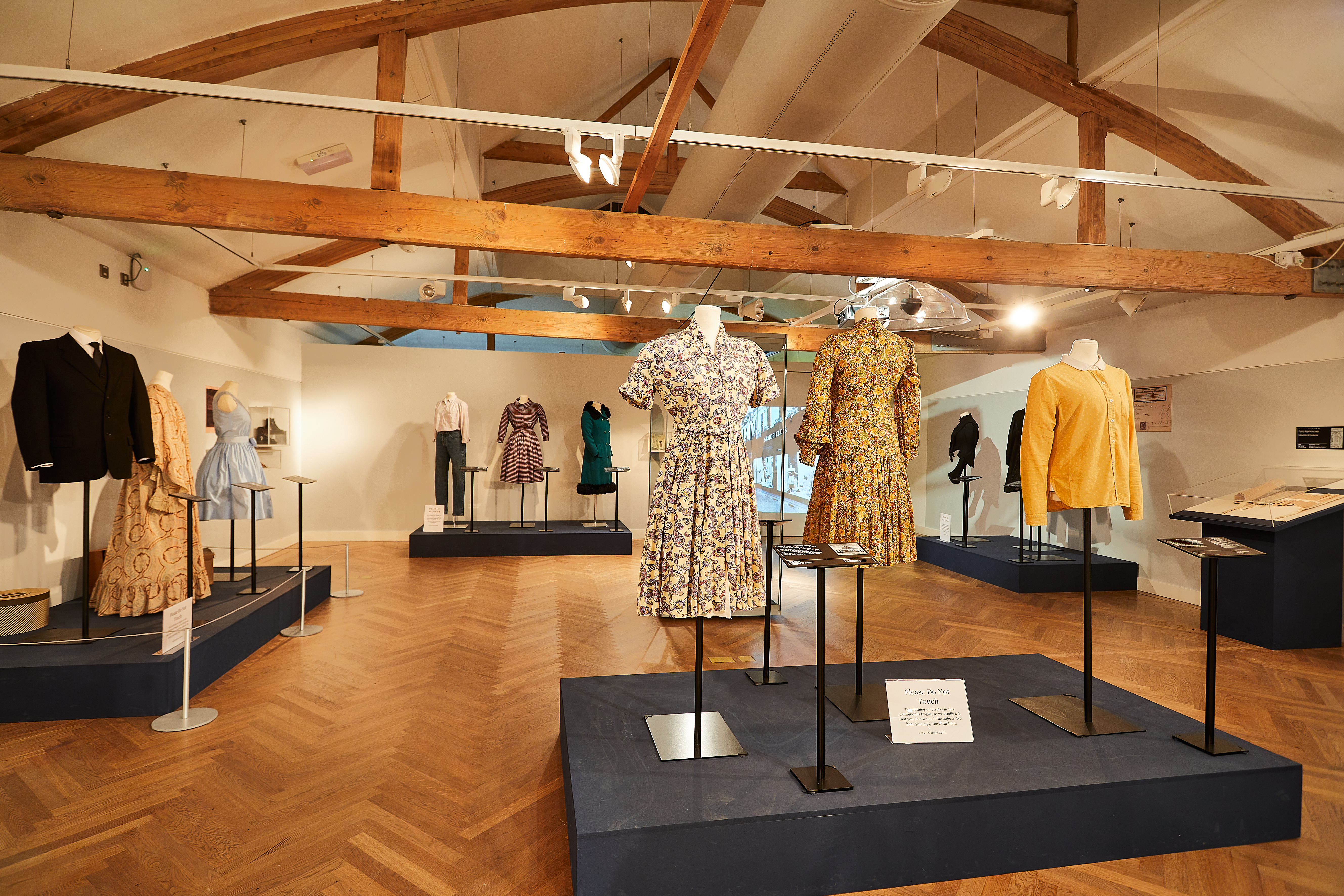 View of the 'Fast X Slow' temporary exhbition at Leeds City Museum, exploring the theme of shopping in Leeds 1720 - 2020. The exhbition was designed to leave lots of space around different clusters of clothes so that visitors can see each object clearly, and to allow for easy access and movement around the exhibition.