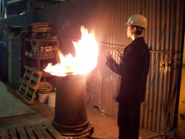 A young Sheffield steel worker warming his hands next to a fire in a steel works.