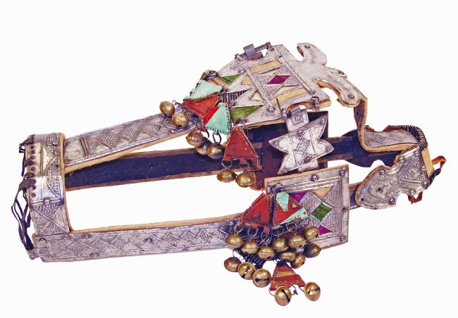 This horse’s headdress would once have been part of a set of parade or show armour rather than being used in battle. The headpiece is called a Kwalkwali. It probably comes from Northern Nigeria, and is typical of the decorative style of the Hausa and Fulani peoples who live in that region of West Africa