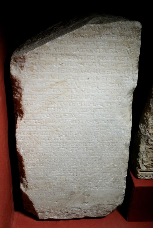 An example of Ancient Greek inscription carved into stone recording the decision of a court sitting.