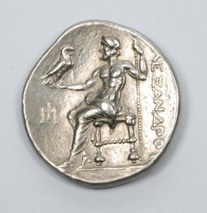 An Ancient Greek silver-coloured coin showing Zeus, in whose honour the Olympic Games were held.