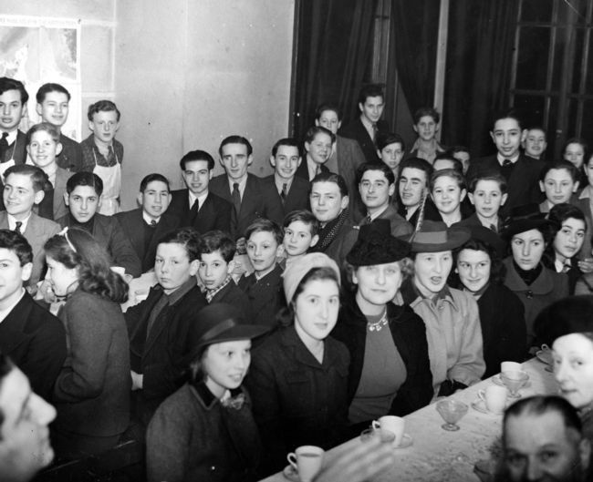 People sitting at tables in the British Restaurant set up in Leeds Town Hall