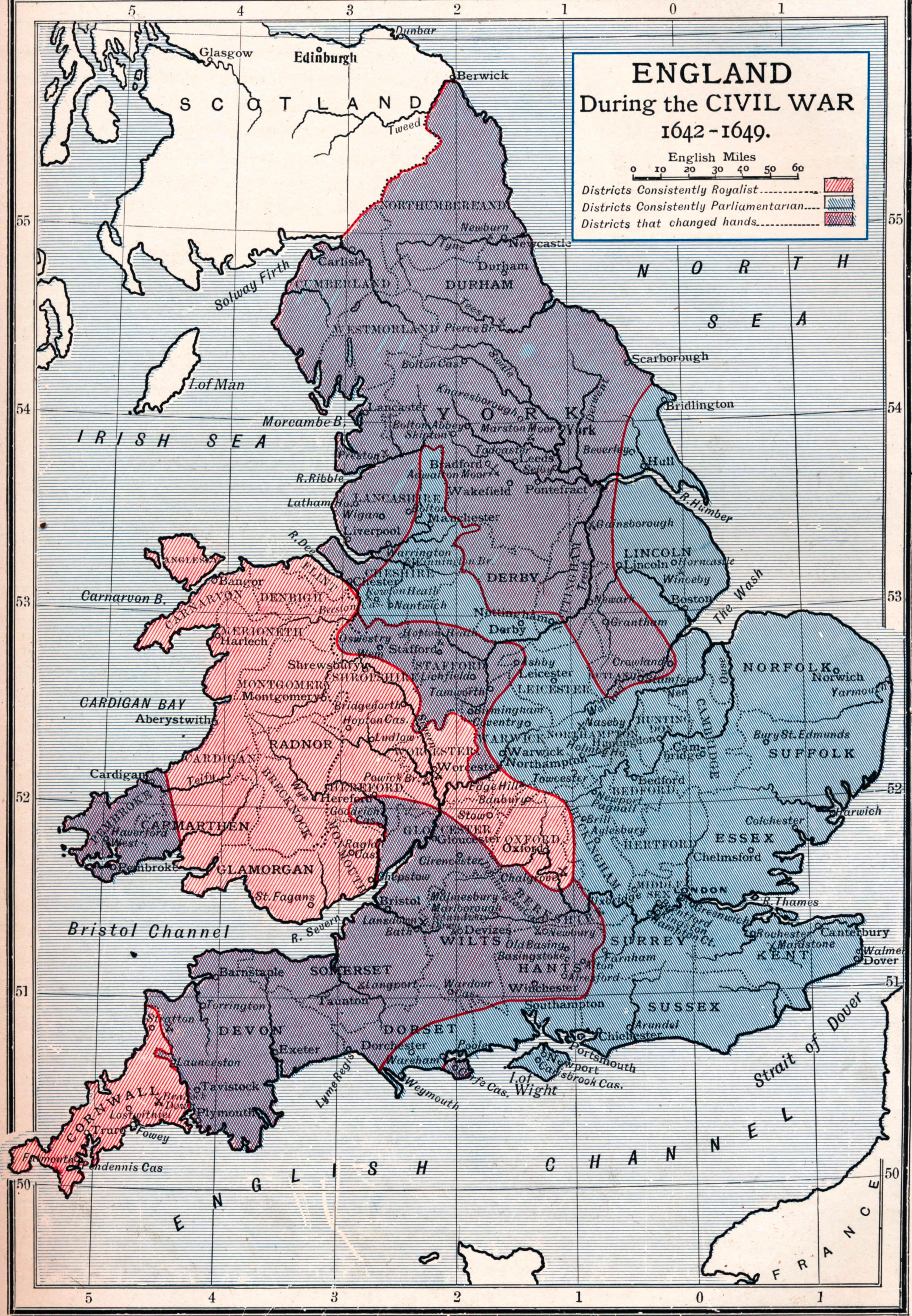 This map of England during the First Civil War shows which areas of the country were Parliamentarian and Royalist, and which areas changed hands during the war.