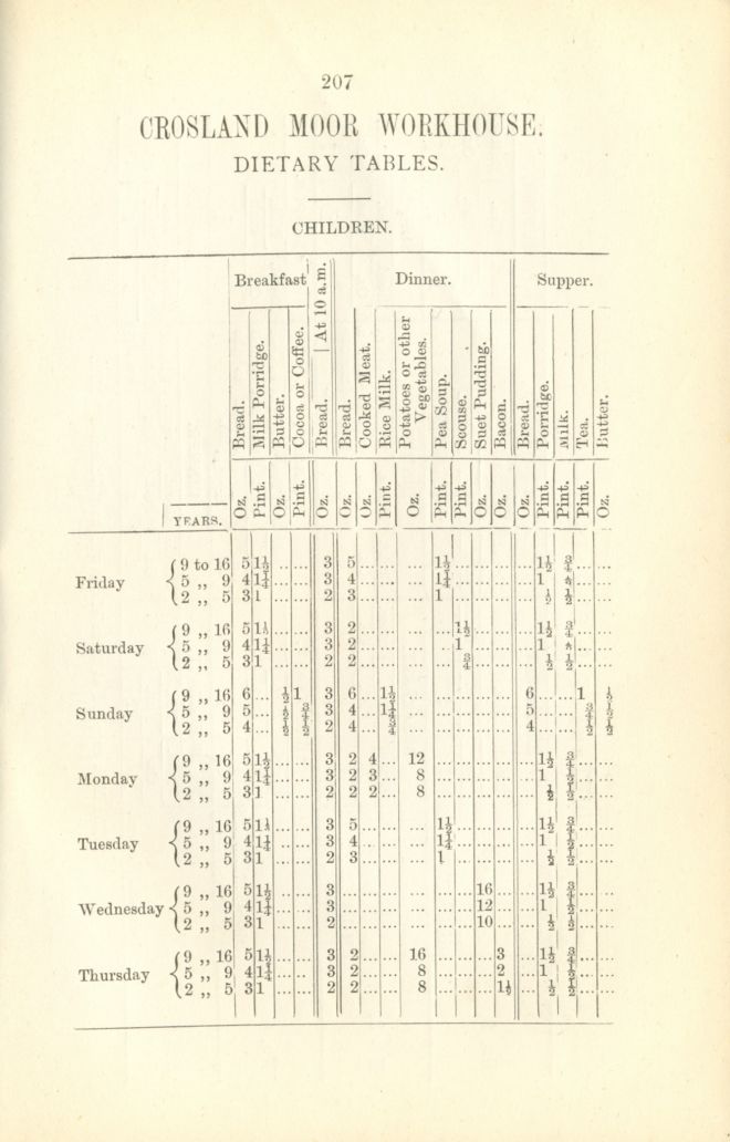 Huddersfield Union Guardians´ Handbook, 1895. Crosland Moor Workhouse Dietary table for children