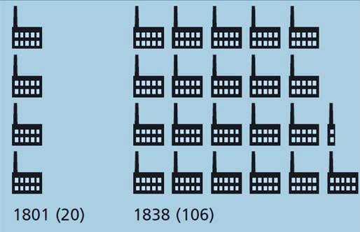 Diagram showing the growth of factories in Leeds from 1801 to 1838