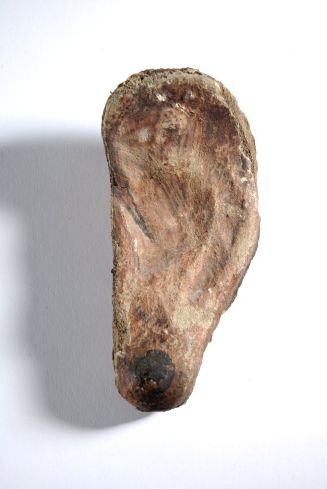 A carved wooden ear. Prosthetic limbs were used to replace or signify damaged parts of the body during the embalming process, so that the body would be complete in the afterlife