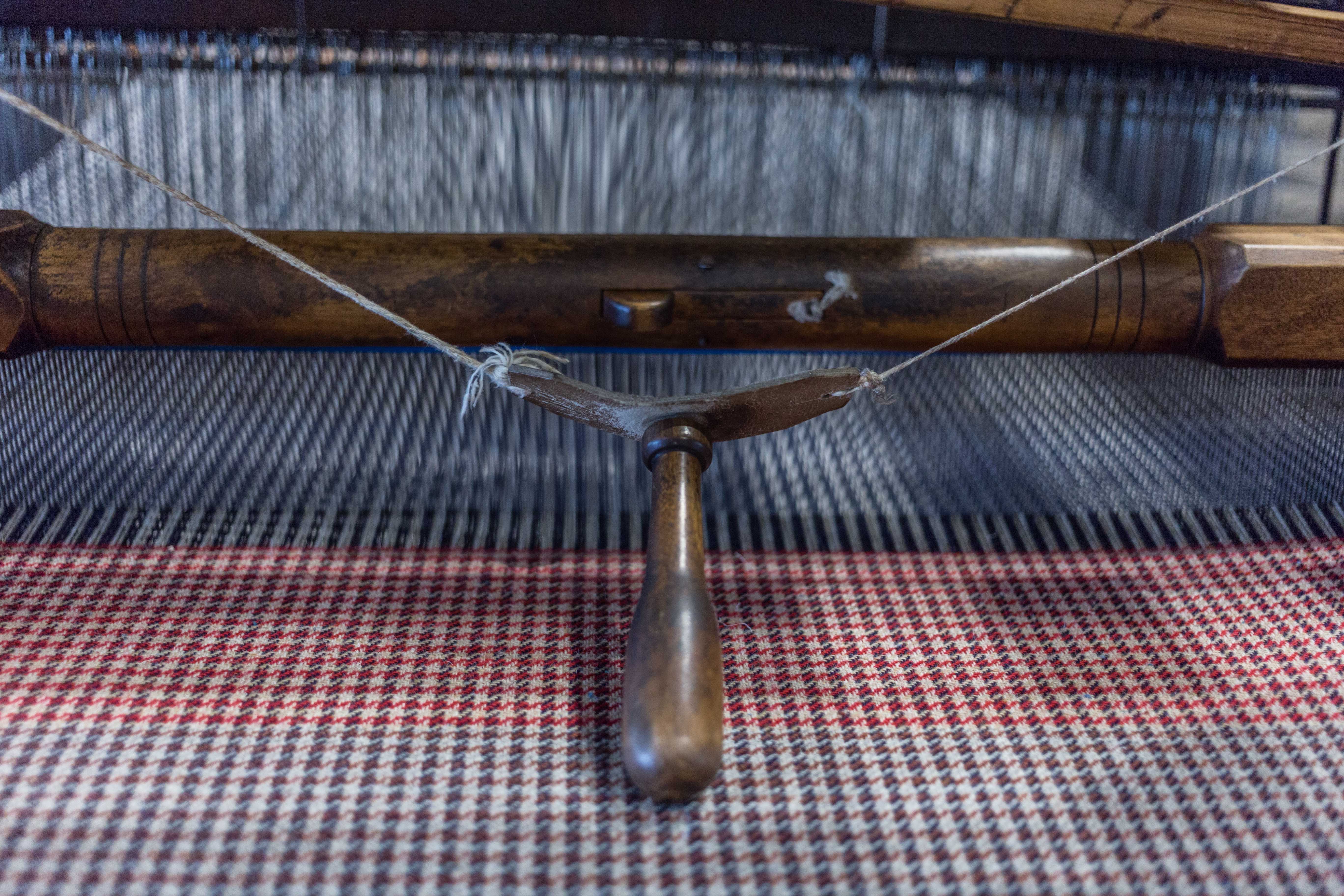 This wooden handle is the handle for ‘flying shuttle’ mechanism, as pulling on it sharply sent the shuttle ‘flying’ across the cloth. It was an important development as it allowed for the creation of wider strips of cloth, and speeded up the weaving process. Before the invention of the flying shuttle, the width of the cloth being woven was determined by the reach of the clothier, as they had to be able to pass the shuttle from hand to hand across the warp. With the introduction of the flying shuttle, there was more demand for spinners, needing approximately 8 spinsters to supply enough yarn for one clothier.