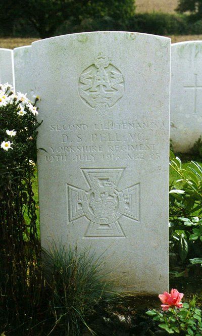 Donald Simpson Bell's gravestone at Gordon Dump Cemetery in Ovillers-la-Boisselle, near Albert in Northern France. Most war graves have a cross engraved under the name dedication, but Donald's shows the Victoria Cross instead.