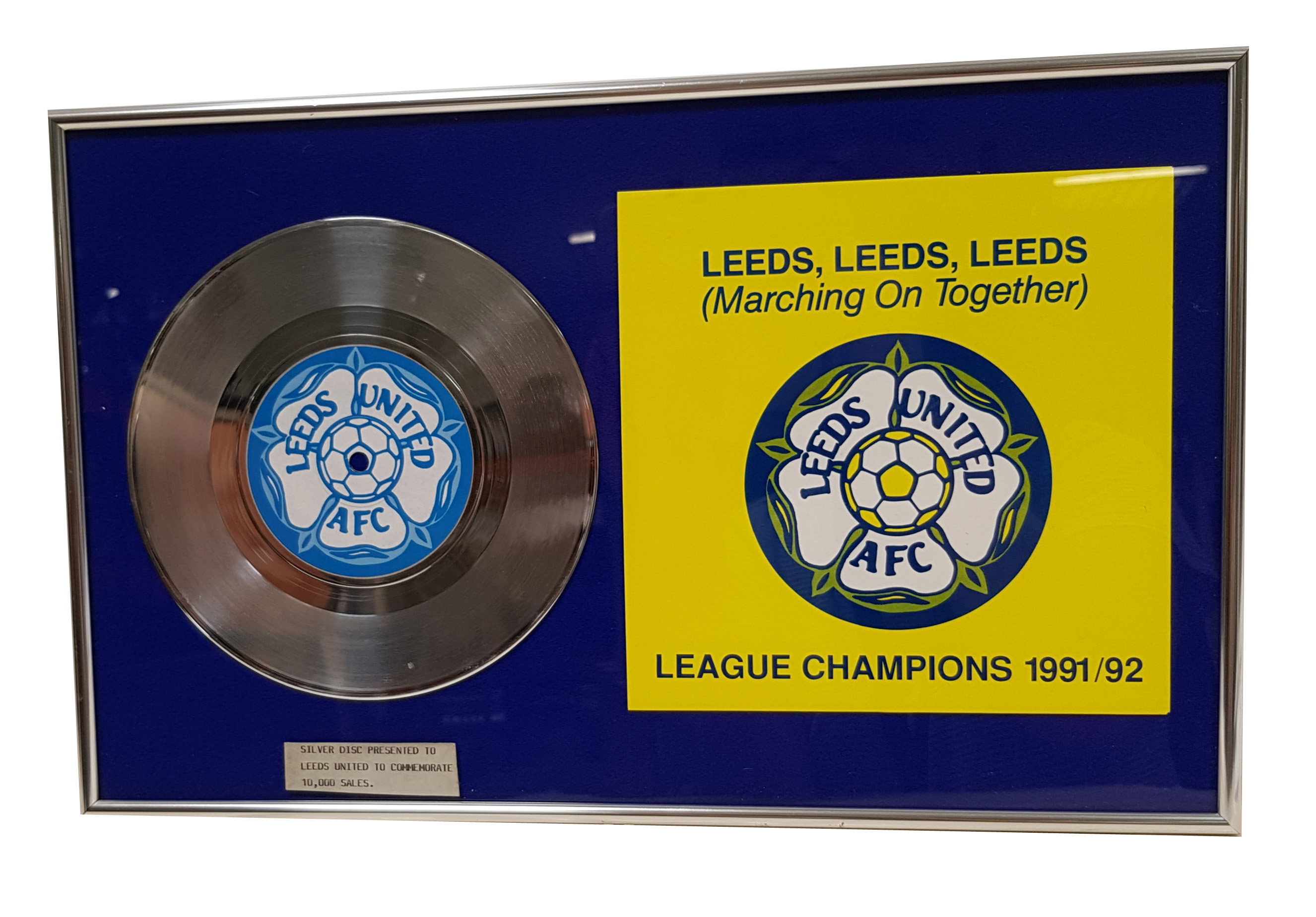 This silver disc of the remixed Leeds United anthem ‘Leeds, Leeds, Leeds” or ‘Marching On Together’ was presented to the club to commemorate 10,000 sales of the single. The song reached number 10 in the Singles Charts in 1972. It was remixed and released again to coincide Leeds being the 1991/1992 Champions