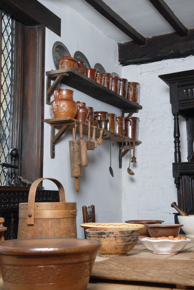 The table and shelves in the kitchen at Shibden Hall, showing the range of implements used.