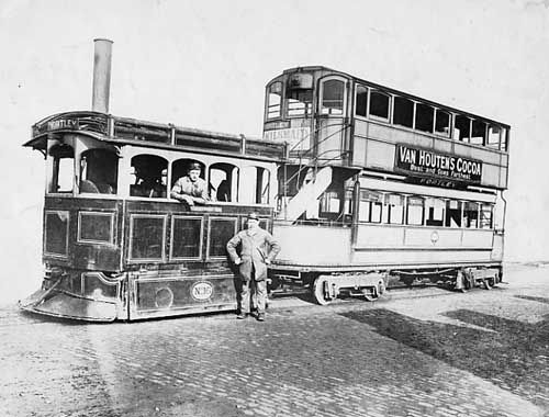 James Kitson's number 16 steam tram with a double-decker Milnes trailer. On the side of the trailer is the insignia of the Leeds Tramways Company © Leeds Library and Information Service.