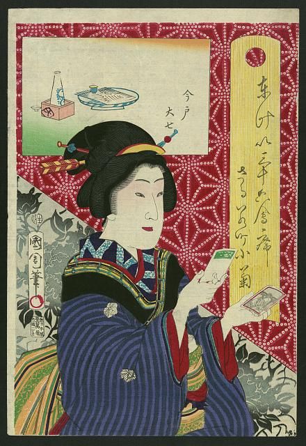 'Kogiku in Saruwaka-Cho' by Toyohara, Kunichika (1878). Ukiyo-e print showing a beautiful woman, Kogiku, looking at photographic portraits (cartes de visite), possibly of her admirers.