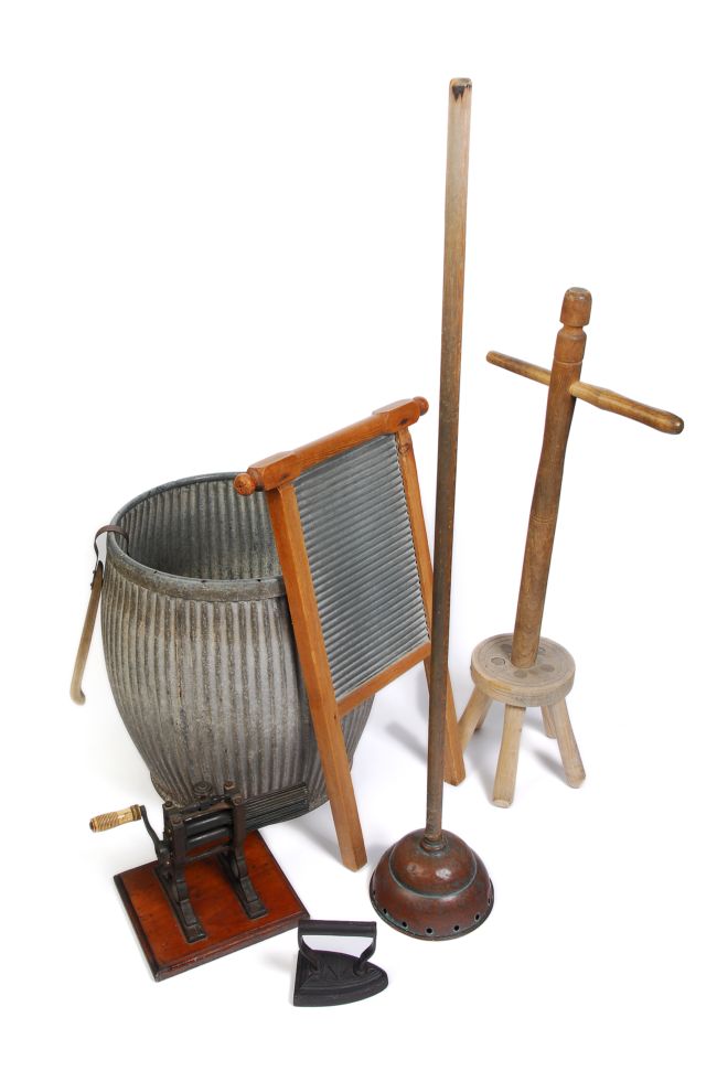 A tub, washboard, posser, dolly, sad iron and crimping iron, all used in the arduous task of completing the laundry