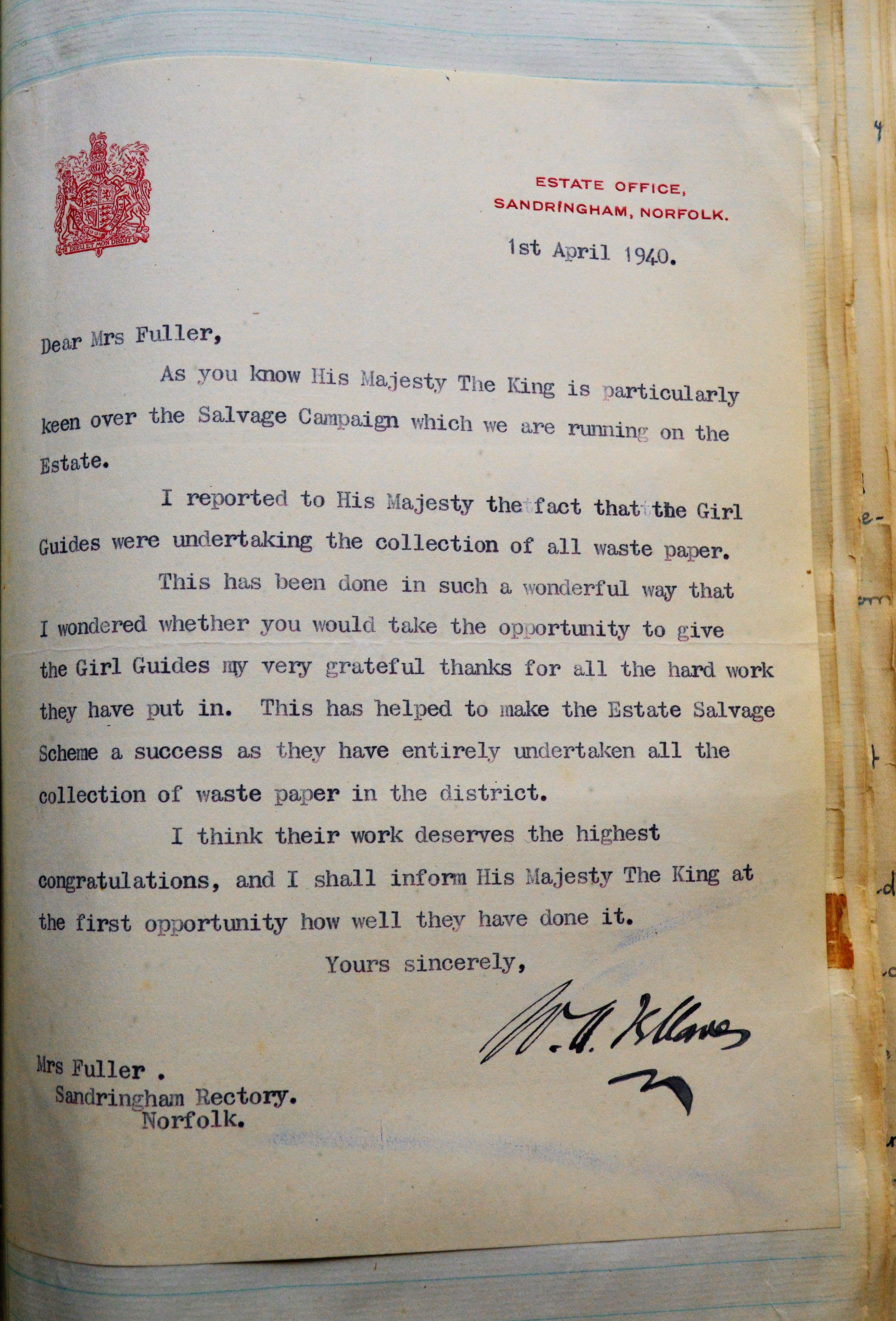 Letter of congratulations sent to Girl Guides thanking them for salvage work during WW2.