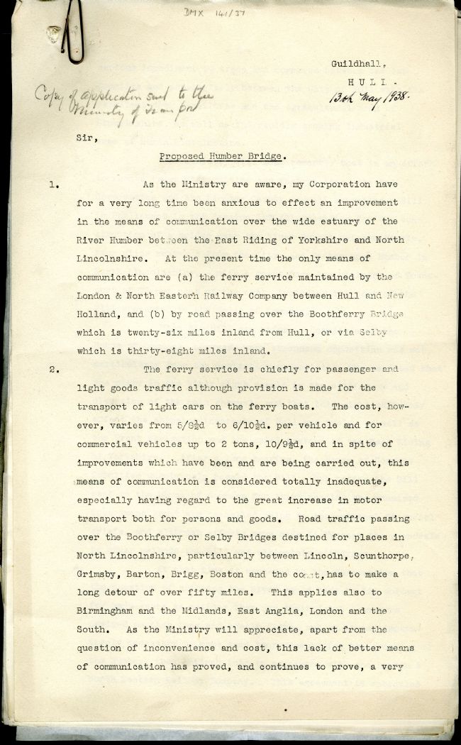Letter pressing for the Humber Bridge to be built. C DMX/141/37