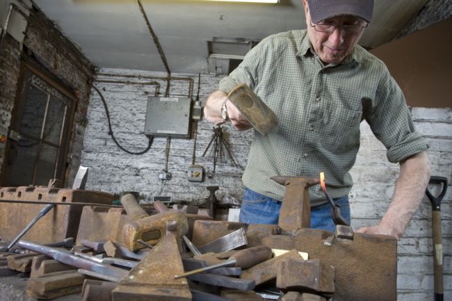 Little Mester, Pete Goss forging scissors at his workbench