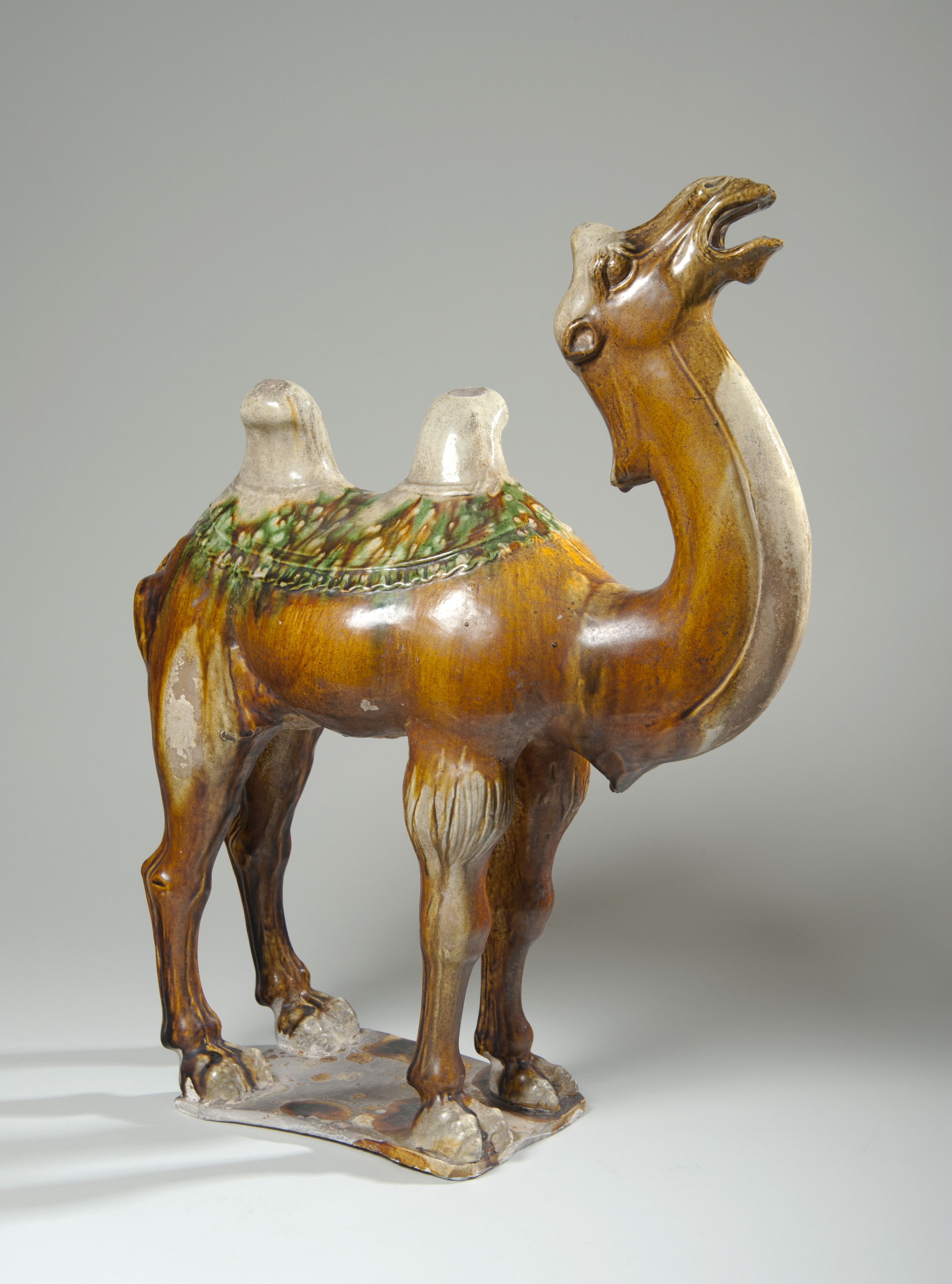 This ceramic camel dates from the Tang dynasty, the 8th century CE. At that time, camels were an important means of transport. It is amazing to think that something so fragile as ceramic has survived for over a thousand years so we can still enjoy it today.