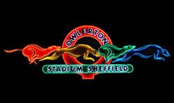 A neon sign advertising Owlerton dog tracks, showing four racing dogs and neon writing saying Owlerton Stadium Sheffield.