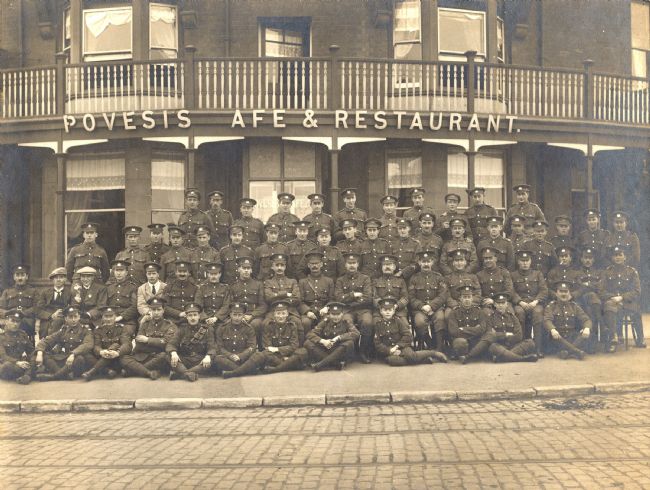 Group portrait of Leeds Pals (15th Service Battalion, Prince of Wales' Own, West Yorkshire Regiment 1st Leeds) outside the Povesis Cafe and Restaurant, Whitley Bay, 1916