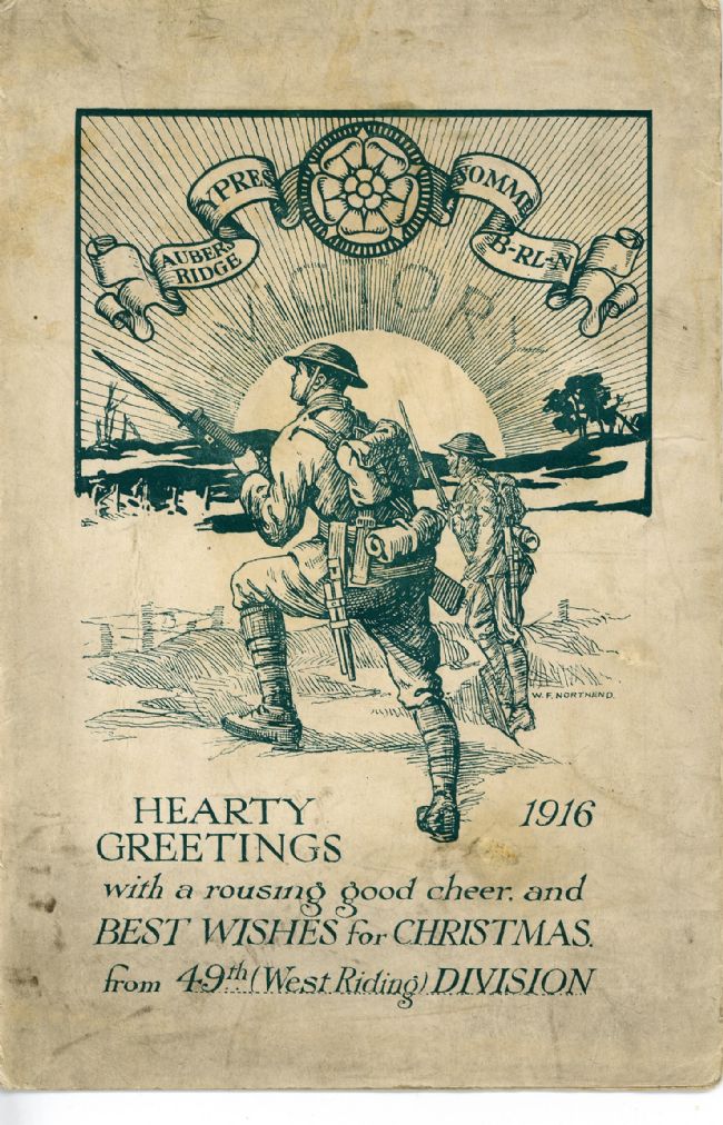 Christmas postcard, inscribed on the back with ‘Hearty Greetings 1916 with a rousing good cheer and BEST WISHES for CHRISTMAS from 49th (West Riding) DIVISION'. The card is signed from Ernest to Amelia and was sent to Miss Amelia (Millie) Cook of 8 Leathley Terrace, Church Street, Hunslet by a member of the Leeds Pals, Harold E. Sykes, in 1916