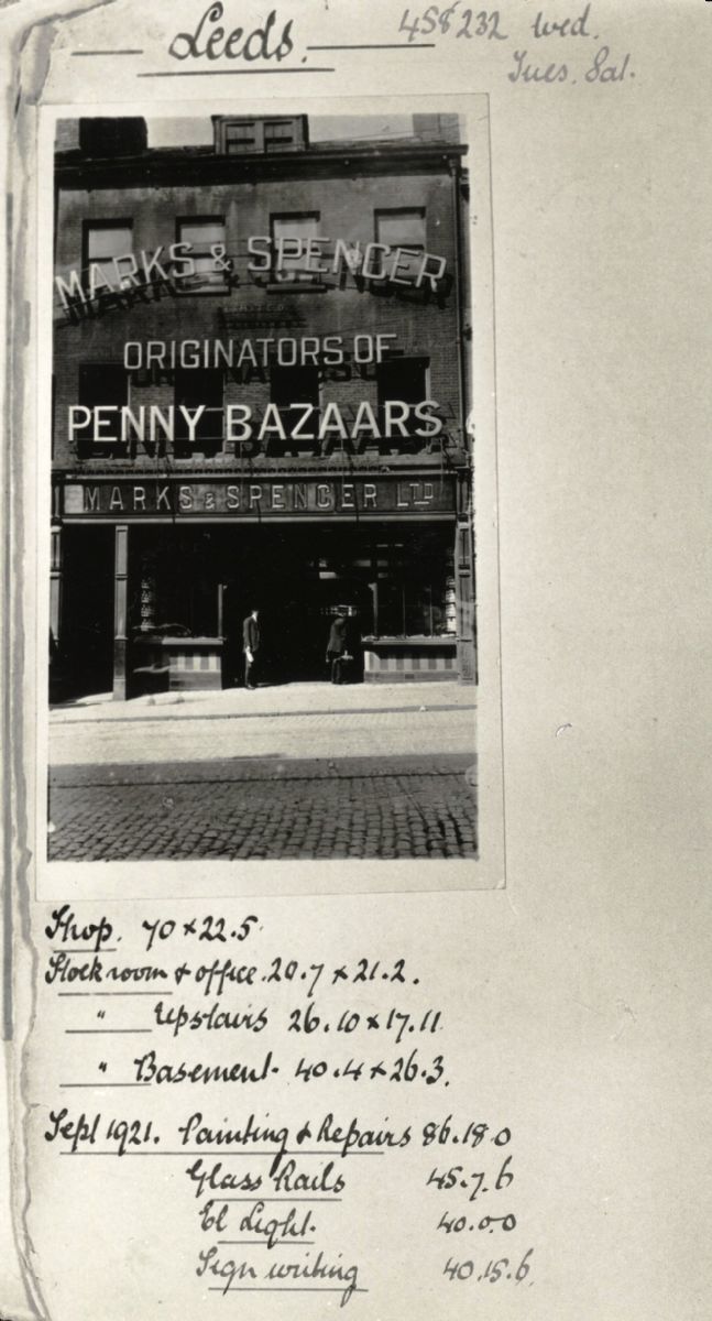 This is a page from an album containing images of all the M&S Penny Bazaars. Each photograph is accompanied by notes about the size of the store, and the cost of any improvements. From this page we can tell that Wednesday was early closing day, and Tuesday and Saturday were market days in Leeds. The album was found by somebody working in the Finance department of M&S, and they passed it on to the archive in the 1980s © M&S Company Archive