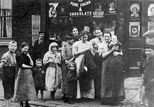 Photo of 19th C poor families in Leeds, shop in background