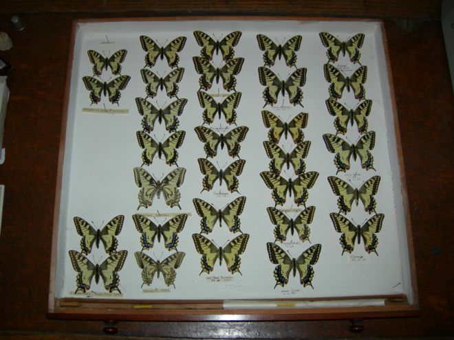 Photograph of a museum case full of Swallow Tail Butterfly specimens.