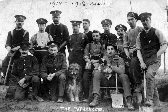 Photograph of men (and dogs) at the East Garforth Gun Emplacement during the First World War. The caption underneath calls them 'The Pathmakers'. (Photograph courtesy of Miss M. Simpson). Image: © Garforth Historical Society | Leeds Library and Information Service