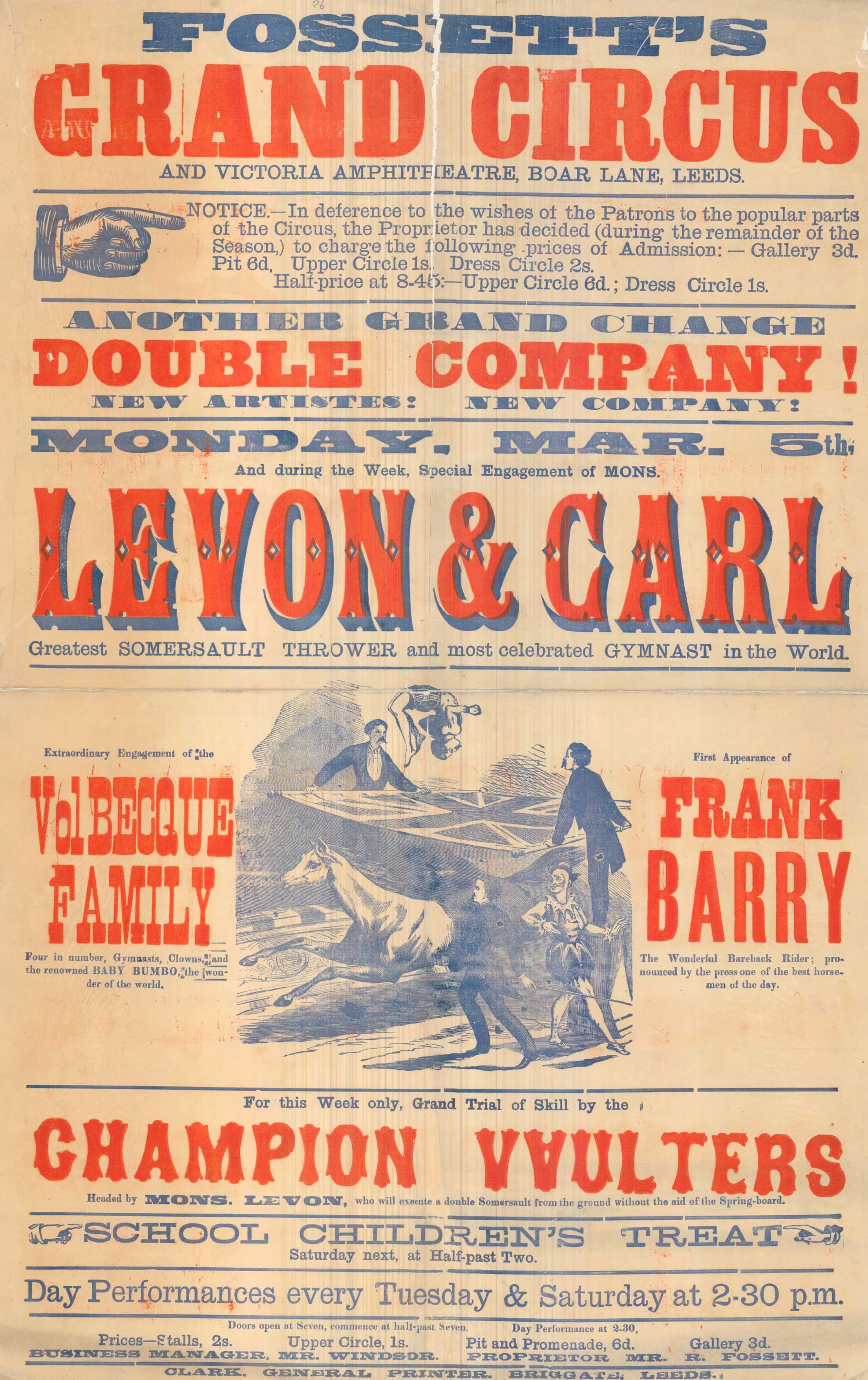 Poster for Fossetts Grand Circus advertising the 'most celebrated gymnast in the world'.
