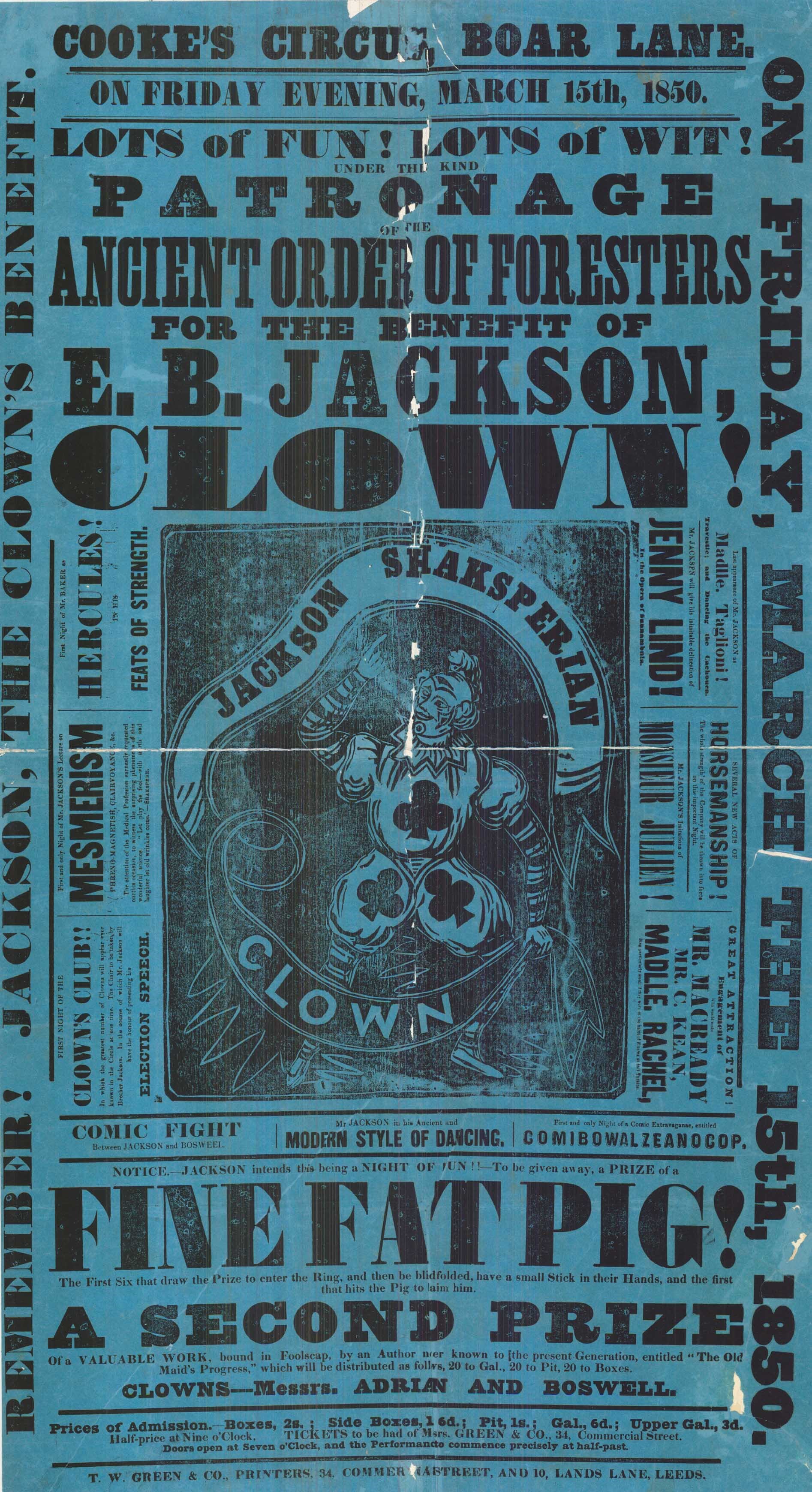 Poster from 1850 for Cookes Circus in Boar Lane. The poster advertises an act called 'Jackson Shaksperian (sic) Clown' and offers 'A fine fat pig' as a prize!