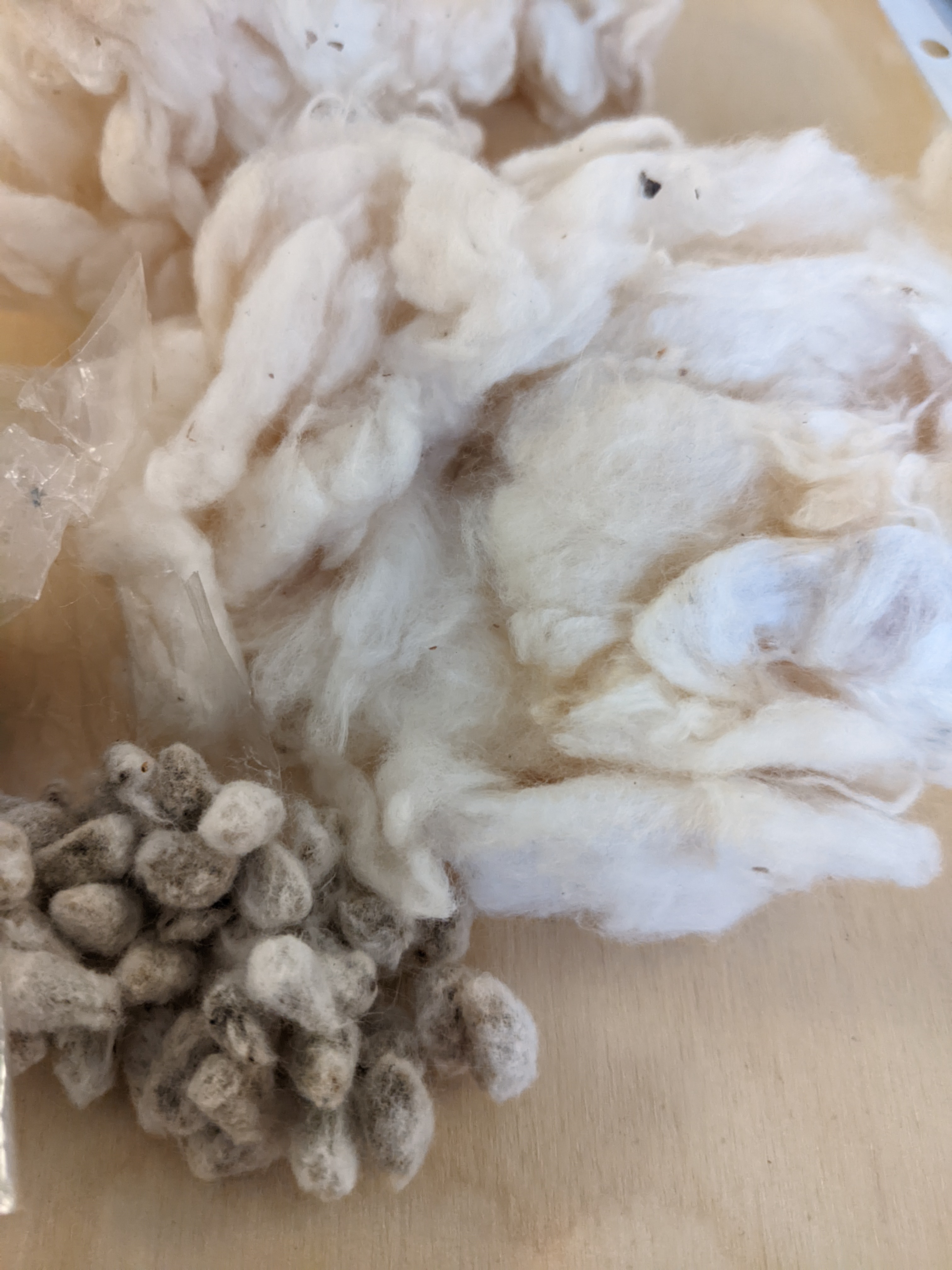 Raw cotton and cotton seeds. The seeds are shown in the bottom left of the photograph.